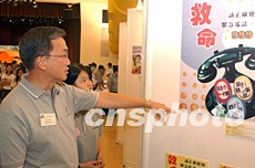 曾蔭培參觀“正確使用999緊急電話”海報(bào)設(shè)計(jì)獲獎(jiǎng)作品。中新社記者:錢興強(qiáng)
