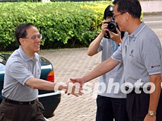 香港警務(wù)處長(zhǎng)曾蔭培,八月二十一日在香港少年警訊滅罪夏令營(yíng)活動(dòng)上,迎候政務(wù)司司長(zhǎng)曾蔭權(quán)。中新社記者:錢興強(qiáng)