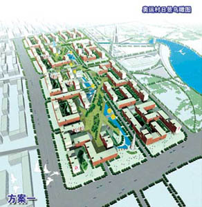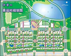 。牐犜谶@個方案中,奧運村布局按雙“喜”字分為四個組團,還設(shè)計了聯(lián)系奧運村中心區(qū)與北部森林公園之間的“景觀通廊”。
