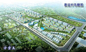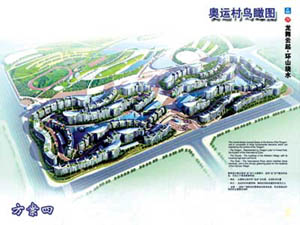 。牐犨@個設(shè)計方案把傳統(tǒng)的中國住宅規(guī)劃模式轉(zhuǎn)化為由奧運五環(huán)幻化而成的曲線,圓形升旗廣場象征“龍珠”。