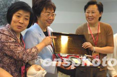 江西與澳門婦女代表成為聯(lián)誼“姊妹團(tuán)”,澳門婦女聯(lián)合會副會長賀定一(左二)與江西婦聯(lián)主席李亞平(右一)互贈禮品。江西代表團(tuán)贈送文房四寶祝愿澳門婦聯(lián)書寫濃墨重彩的新篇章。中新社記者:廖文靜