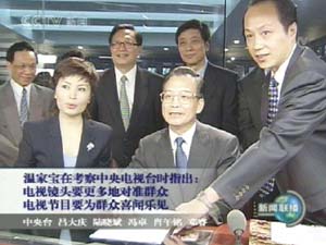 中新網(wǎng)8月26日電 中共中央政治局常委、國務(wù)院總理溫家寶今天(26日)下午在考察中央電視臺(tái)時(shí)指出,電視宣傳要更多地展示改革開放和現(xiàn)代化建設(shè)的新成就,電視鏡頭要更多地對(duì)準(zhǔn)群眾,電視報(bào)道要更多地反映廣大群眾的意愿,電視節(jié)目要更多地創(chuàng)造廣大群眾喜聞樂見的內(nèi)容和形式。