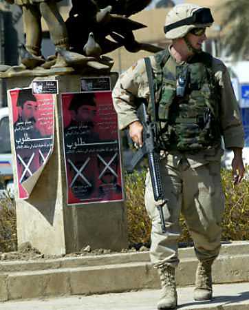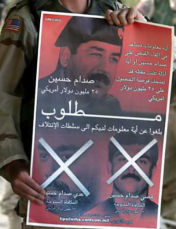 美軍士兵和伊拉克警察到處張貼懸賞捉拿薩達(dá)姆的海報(bào)時(shí)引來(lái)了眾多巴格達(dá)市民的圍觀。圍觀的人群當(dāng)中對(duì)捉拿薩達(dá)姆一事各有各的看法,一名現(xiàn)年23歲的伊拉克牙科醫(yī)生海德?tīng)枴ぐ⒗锉硎荆骸拔艺J(rèn)為他們遲早會(huì)捉到薩達(dá)姆的,但有一些人似乎不知道任何有關(guān)這巨額獎(jiǎng)賞的事。”