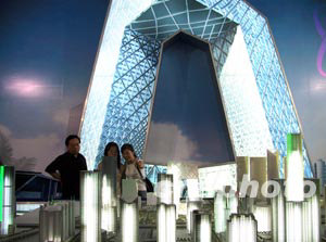 一進(jìn)展廳,只見趙忠祥、李瑞英、羅京笑瞇瞇地坐在臺(tái)前,馬上把觀眾帶入《新聞聯(lián)播》的氛圍中。這是第一個(gè)展區(qū):走近央視,包括央視臺(tái)標(biāo)簡(jiǎn)介、十三個(gè)頻道簡(jiǎn)介及屏幕的實(shí)時(shí)播出畫面、大型電視墻等,著名主持人、記者和編導(dǎo)也將在此與觀眾面對(duì)面交流。另有互動(dòng)平臺(tái)、經(jīng)典薈萃、走向世界、數(shù)字浪潮、未來時(shí)空等一共十個(gè)展區(qū),回顧了中國中央電視臺(tái)四十五年發(fā)展史,并展示了新臺(tái)址工程。