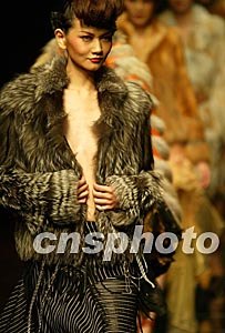 中國當代六位最優(yōu)秀的時裝設計師,今秋十月十三日將在法國巴黎時裝周上展示新作,中國最優(yōu)秀的十名模特為她們表演極具東方魅力的中華時尚服飾。圖為中國設計師武學凱的皮草新作。中新社記者:賈國榮