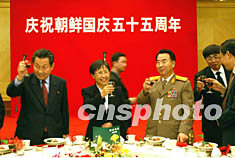 中國人民對(duì)外友好協(xié)會(huì)九月四日在北京舉行慶祝朝鮮建國五十五周年招待會(huì),中國全國人大常委會(huì)副委員長(zhǎng)烏云琪木格(左二)出席,并與朝鮮駐華大使崔鎮(zhèn)洙(左一)等一起舉杯共祝朝鮮國慶。中新社記者:毛建軍