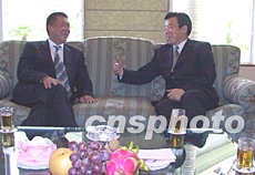 福建省省長(zhǎng)盧展工(右一),七日下午在廈門悅?cè)A酒店與剛剛抵達(dá)廈門出席第七屆投洽會(huì)的澳門特別行政區(qū)行政長(zhǎng)官何厚鏵(左一)親切交談。中新社記者:劉可耕
