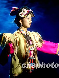 四川省九寨溝民族藝術(shù)團(tuán)如今每天為當(dāng)?shù)刂型庥慰团e行篝火晚會,羌族姑娘展示昔日游牧生活的服飾,漂亮而實用。中新社記者:賈國榮