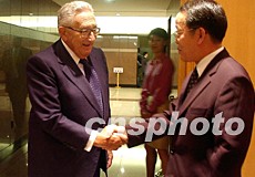 美國(guó)前國(guó)務(wù)卿基辛格(左)八日來到紐約的中國(guó)常駐聯(lián)合國(guó)代表團(tuán)駐地,參加王光亞(右)舉行的就職招待會(huì),并向王光亞出任中國(guó)常駐聯(lián)合國(guó)代表表示祝賀。作者:龔文謨