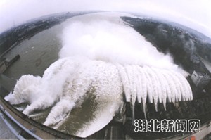 中新湖北網(wǎng)9月9日電 漢江第二次洪峰于八日凌晨一點(diǎn)到達(dá)丹江口水庫(kù),最大洪峰流量達(dá)二萬(wàn)八千五百立方米每秒,大約在今天下午五點(diǎn)丹江口水庫(kù)水位將達(dá)到一百五十六點(diǎn)七米,為一九八四年來(lái)最高水位。為緩解對(duì)水庫(kù)壓力,丹江口水庫(kù)開(kāi)閘向下游泄洪。劉鐵軍 攝