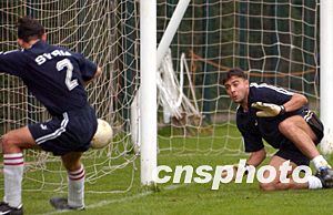 九月九日下午,敘利亞隊(duì)U23隊(duì)(國(guó)奧隊(duì))在昆明紅塔足球訓(xùn)練基地參加賽前最后一次訓(xùn)練。圖為敘利亞隊(duì)守門員準(zhǔn)備撲救門前球。中新社記者:張煒