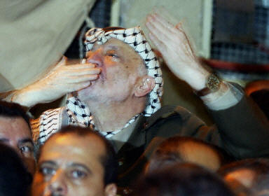 就在以色列做出上述決定的同時,阿拉法特依然受到數(shù)千支持者的擁戴,當他在周三走出辦公總部時無數(shù)的支持者在向他歡呼。身旁有保鏢保護的阿拉法特向支持者拋去飛吻,并做出勝利的姿式。在加沙城市中心,5000多人走上街頭進行游行表達對阿拉法特的支持。(春風)