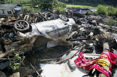 韓國氣象部門透露,140萬個(gè)家庭已經(jīng)斷電;317公頃的田地和大批公路被大水淹沒。
