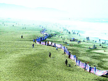 中新網(wǎng)9月15日電 由舊金山華裔藝術(shù)家趙建海設(shè)計(jì)的大地藝術(shù)作品旗!白杂身灐,九月七日在紐約自由神像島上飄揚(yáng),13日再現(xiàn)舊金山市海灘。