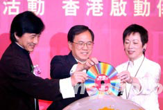香港旅游發(fā)展局9月15日推出全新的「香港-樂在此,愛在此!」全球廣告宣傳活動,政務司長曾蔭權(quán)[中]、旅游發(fā)展局主席周梁淑怡[右]及香港旅游大使成龍出席主持啟動儀式。作者:洪少葵
