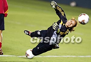 美國當?shù)貢r間9月19日晚,參加2003女足世界杯的中國女足在美國洛杉磯南部小城卡森進行熱身訓(xùn)練。圖為守門員趙燕在訓(xùn)練中。作者:劉占坤
