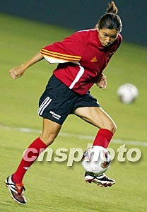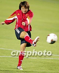 美國當?shù)貢r間9月19日晚,參加2003女足世界杯的中國女足在美國洛杉磯南部小城卡進行適應(yīng)場地的熱身訓(xùn)練。圖為孫雯在訓(xùn)練中苦練射門。作者:劉占坤
