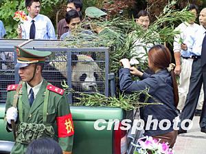 中午二時(shí)許,八只國寶大熊貓抵達(dá)雅安碧峰峽研究基地,藏漢民眾和碧峰峽研究基地的工作人員手持鮮花、彩旗隆重夾道歡迎國寶平安抵達(dá)。歡迎儀式結(jié)束之后,八臺(tái)大熊貓專車往新居行近,武警戰(zhàn)士將這八只大熊貓?zhí)нM(jìn)了它們的“豪華別墅”。這八只大熊貓忽閃忽閃的眼神,顯示著它們的新奇與不安。畢竟這是一個(gè)陌生的世界。大熊貓遷入新居時(shí),一些大熊貓發(fā)怪叫聲,有的在房里轉(zhuǎn)來轉(zhuǎn)去,但是,當(dāng)護(hù)養(yǎng)人員將竹子、蘋果送給它們吃時(shí),即刻恢復(fù)了常態(tài)。