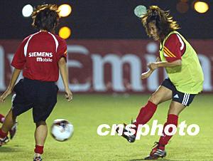 美國(guó)當(dāng)?shù)貢r(shí)間9月20日晚7點(diǎn),參加女足世界杯的中國(guó)女足在美國(guó)洛杉磯南部小城卡森體育場(chǎng)開(kāi)賽前的最后一場(chǎng)熱身訓(xùn)練。圖為范運(yùn)杰在訓(xùn)練中突破射門(mén)。作者:劉占坤