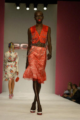 9月22日在倫敦時(shí)裝周上,模特現(xiàn)場(chǎng)展示了2004春夏最新流行服飾。