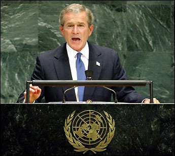 布什繼續(xù)捍衛(wèi)對(duì)伊戰(zhàn)爭(zhēng)的合理性,為其未經(jīng)聯(lián)合國(guó)授權(quán)而對(duì)伊拉克采取的單邊軍事行動(dòng)辯解,指薩達(dá)姆政權(quán)的倒臺(tái)使伊拉克人民可以建設(shè)一個(gè)自由的社會(huì),伊拉克的成功將說(shuō)明繁榮和穩(wěn)定在中東地區(qū)是可以實(shí)現(xiàn)的。