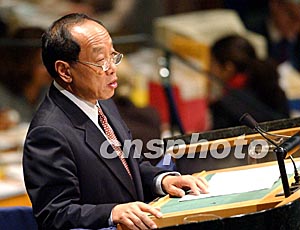 中國外長李肇星九月二十四日在第五十八屆聯(lián)大一般性辯論中發(fā)言時表示,為了維護(hù)世界和平,促進(jìn)共同發(fā)展,應(yīng)該加強(qiáng)國際合作,走多邊主義道路,促進(jìn)世界多極化。中新社記者:趙海燕
