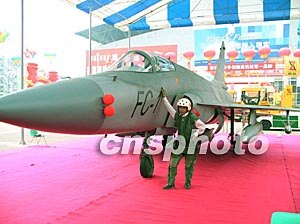 “梟龍”殲擊機(jī)亮相25日開幕的第四屆中國(guó)西博會(huì)。這架“梟龍”飛機(jī)模型是根據(jù)真實(shí)的“梟龍”殲擊機(jī)以一比一的比例制造而成。圖為一市民穿著飛行員制服與“梟龍”殲擊機(jī)親密接觸。作者:陳雯