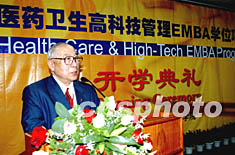 中山大學醫(yī)藥衛(wèi)生高科技管理EMBA學位項目的開學典禮二十六日在廣州中山大學嶺南學院舉行,這是中國第一個獲準頒發(fā)醫(yī)療服務方向管理教育(EMBA)學位的項目。圖為嶺南(大學)學院董事會名譽主席伍沾德先生在典禮上致詞。作者:羅仰明