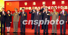香港行政長官董建華九月二十六日出席香港新聞界慶祝中華人民共和國成立五十四周年國慶酒會(huì)。圖為董建華(右四)等向嘉賓祝酒。中新社圖