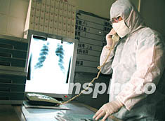 二十八日下午,廣東肇慶舉行防SARS應(yīng)急演練,以便在國(guó)慶黃金周來臨之際做好非典防治工作。圖為演練中醫(yī)生及時(shí)向上級(jí)部門報(bào)告SARS疫情。作者:黃耀輝