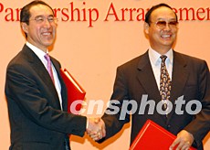 “內(nèi)地與香港關(guān)于建立更緊密經(jīng)貿(mào)關(guān)系的安排”附件簽署儀式,九月二十九日在香港舉行,商務部副部長安民和香港財政司司長唐英年,分別代表中央人民政府和香港特別行政區(qū)政府,簽署“內(nèi)地與香港關(guān)于建立更緊密經(jīng)貿(mào)關(guān)系的安排”附件。中新社記者:錢興強