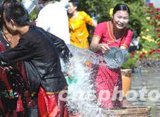 北京中華民族園十月國(guó)慶節(jié)期間各民族景區(qū)分別舉行傳統(tǒng)節(jié)日文化遺產(chǎn)展示活動(dòng),在傣族潑水節(jié)場(chǎng)地,各民族民眾以潑水形式祝福朋友的幸福和快樂(lè)。中新社記者:鄒憲