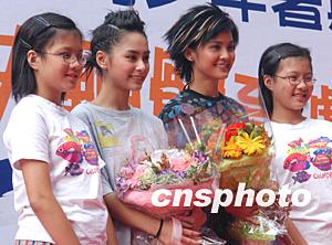 香港樂壇人氣組合TWINS,十月四日出席在香港理工大學(xué)舉辦的青少年體育嘉年華活動,兩名理大學(xué)生向TWINS獻(xiàn)花。中新社記者:錢興強(qiáng)