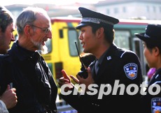 參加國慶值勤的北京警察學院學員,四日在天安門廣場為外國游人解答問題!笆弧逼陂g首都警方加大了旅游景區(qū)的值勤力量,以確保游客安全。中新社記者:宋吉河