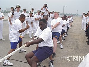 23日,中美海軍首先進(jìn)行了拔河友誼比賽。拔河比賽應(yīng)該說是中國海軍水兵的強(qiáng)項(xiàng),在97年南海艦隊(duì)對美洲四國五港的訪問中,中國海軍水兵拔河隊(duì)一路上攻城拔寨、未嘗敗績。但這次美國水兵拔河隊(duì)是有備而來,且來者不善。15名隊(duì)員個(gè)個(gè)膀大腰圓、粗壯結(jié)實(shí),比如,其中一名黑人隊(duì)員桑塔納(SANTANA),此人身高199CM,體重250斤,來自美國亞特蘭大,是艦上的武器部門人員。中方隊(duì)員與對手相比在塊頭上明顯吃了虧,處于劣勢。比賽開始前,美方隊(duì)員圍在一起,大聲鼓勁。比賽開始后,中方水兵拔河隊(duì)奮力與對手展開拉鋸戰(zhàn),雖拼盡全力,無奈實(shí)力稍遜一籌,最后不無遺憾地輸?shù)舯荣,美國水兵也算?bào)了上次比賽的一箭之仇。