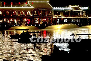 裝點(diǎn)一新的北京什剎海成為“十一”黃金周的新熱點(diǎn),泛舟在海上的游客陶醉在古色古香的夜景中。中新社記者:鄭萍萍