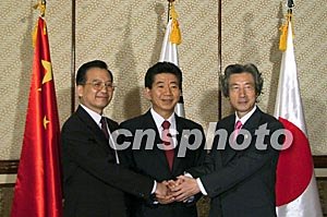 我們?nèi)龂I(lǐng)導人一致認識到,中日韓推進三方合作已經(jīng)具備了堅實的基礎(chǔ),確信拓展和深化三方合作不僅有利于進一步推動三國間雙邊關(guān)系的穩(wěn)定發(fā)展,而且有利于實現(xiàn)整個東亞的和平、穩(wěn)定和繁榮。