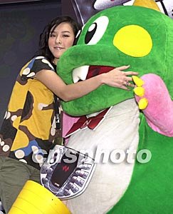 歌星李蘢怡10月7日在香港出席諾基亞N-Gage手提游戲機(jī)推廣活動(dòng),擁抱可愛的卡通人物“泡泡龍”。作者:鄧慶樂