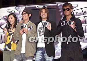 諾基亞N-Gage手提游戲機(jī)10月7日在香港舉行推廣活動(dòng),大會(huì)特別邀請(qǐng)演藝界喜好“打機(jī)一族”古天樂、馮德倫、余文樂、李蘢怡(右起)出席活動(dòng),諾基亞N-Gage除具備三頻通訊功能外,更有流動(dòng)游戲機(jī)功能。作者:鄧慶樂