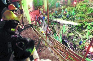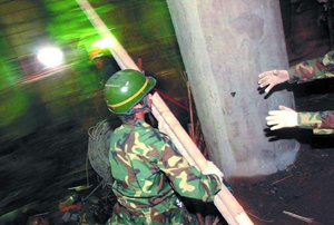 昨天晚上8時30分,記者在搶險現(xiàn)場守侯,一名因疲勞過度的三水拆船廠的搶險工人從工地走出來,記者立即圍上前詢問現(xiàn)場搶險救援的情況。該工人說,他們是昨天上午11時許接到拆船廠負責(zé)人的指示,要他們立即集合前往新會一發(fā)生倒塌事故的建筑工地上救人,于是他們穿上工作服就來了。據(jù)介紹,他們大約來了30人左右,分為三班倒。他們實施搶救的主要步驟時,首先將高空中墜落地面的大約100多平方米的鐵板用電焊將他們燒開,用大型的吊車將鐵板吊開,然后再將壓在地下的工人從鐵板下“拔”出來。主要的困難是鐵板從高空墜下,其速度非常快,在慣性的作用下,將眾多的雜物如竹子、木頭、鐵棍等夾雜在其中。預(yù)計下面被埋的還有10人左右,他們正與搶險的其他工人爭分奪秒,估計將通宵搶險。