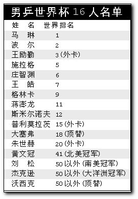 盡管薩姆索諾夫因故放棄參賽,孔令輝也由于排名限制而無(wú)緣與會(huì),然而參賽的十六名選手已可代表當(dāng)今男子乒壇的最高水平。