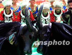 貴州省黔東南自治州苗族青年節(jié)日期間為游客表演斗牛歌舞,展示當(dāng)?shù)孛褡鍌鹘y(tǒng)文化,豐富旅游內(nèi)容。中新社記者:宋吉河