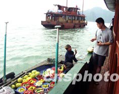 下龍灣離越南首都河內(nèi)165公里,有成千座石島,島上有許多山洞,可以互相貫穿,并呈現(xiàn)不同的形狀,是世界奇觀之一,盡管氣候炎熱,仍有游客接踵而至。圖為在下龍灣游覽的中國游客向船家購買新鮮水果。作者:陶社蘭