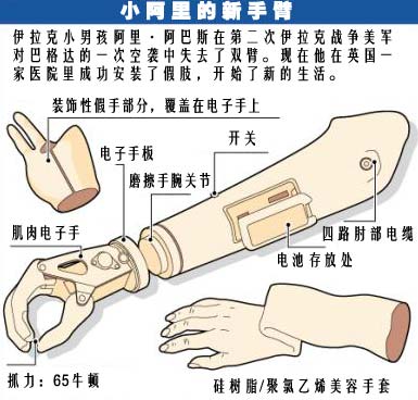 中新網(wǎng)10月13日電 據(jù)路透社報道,英國一家報紙星期一報道說,在伊拉克戰(zhàn)爭中失去雙臂和大部分家人的伊拉克男童已成功地安裝上了人造假肢。