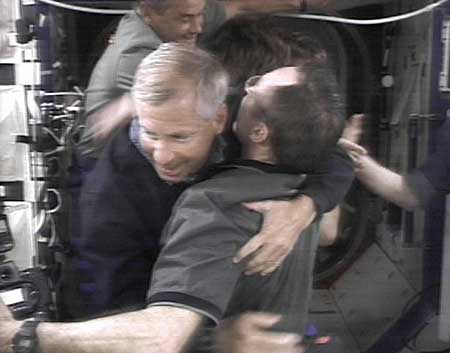 2002年6月7日,美國“奮進(jìn)”號(hào)航天飛機(jī)載著幾噸重的補(bǔ)給品、空間建筑材料和來自美、俄、法3個(gè)國家的7名機(jī)組人員,成功與國際空間站進(jìn)行了對(duì)接。這是“奮進(jìn)”號(hào)機(jī)組人員與空間站上的宇航員親切擁抱。新華社圖