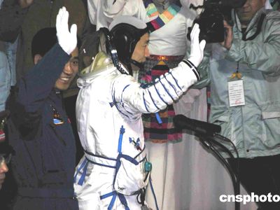 身穿乳白色航天服的中國(guó)首位航天員楊利偉,十五日早晨在酒泉衛(wèi)星發(fā)射中心航天員公寓受命出征太空。中新社記者 孫自法 攝