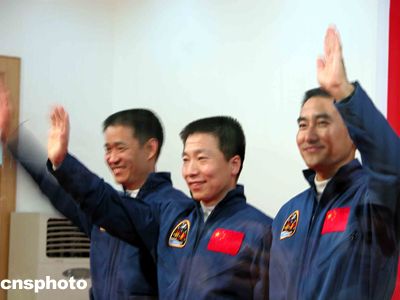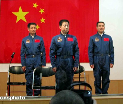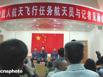 “神舟”五號(hào)載人飛船發(fā)射前夕,中國(guó)首次載人航天飛行航天員梯隊(duì)的三名航天員楊利偉(中)、翟志剛(右)聶海勝與記者見(jiàn)面,并回答記者提問(wèn)。這也是中國(guó)航天員首次公開(kāi)亮相。中新社記者孫自法攝