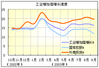 中國(guó)9月份工業(yè)生產(chǎn)主要情況及特點(diǎn)包括:國(guó)有、股份制、“三資”企業(yè)生產(chǎn)增速有所回落,集體企業(yè)生產(chǎn)增長(zhǎng)加快。9月份,國(guó)有及國(guó)有控股企業(yè)完成增加值1672億元,比上年同月增長(zhǎng)11.6%,減慢2.4個(gè)百分點(diǎn);股份制企業(yè)增加值1506億元,增長(zhǎng)16.5%,增速比上月減慢1.4個(gè)百分點(diǎn);“三資”企業(yè)增加值1026億元,增長(zhǎng)19.4%,減慢1.3個(gè)百分點(diǎn)。集體企業(yè)和股份合作企業(yè)生產(chǎn)增長(zhǎng)則分別比上月加快1和5.1個(gè)百分點(diǎn)。