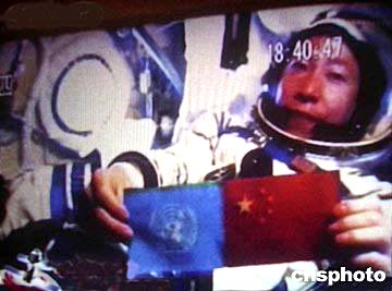 中國首位航天員楊利偉乘坐“神舟”五號飛船在太空飛行時展示聯(lián)合國旗幟與中國國旗!吧裰邸蔽逄栵w船北京時間十月十六日六時二十三分在內(nèi)蒙古中部地區(qū)成功著陸,中國首次載人航天飛行任務獲得圓滿成功。作者:賈國榮