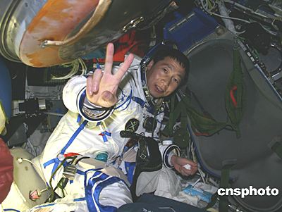 “神舟”五號載人飛船成功著陸,航天員楊利偉在返回艙艙內(nèi)用“V”字手勢示意勝利。作者:孫陽